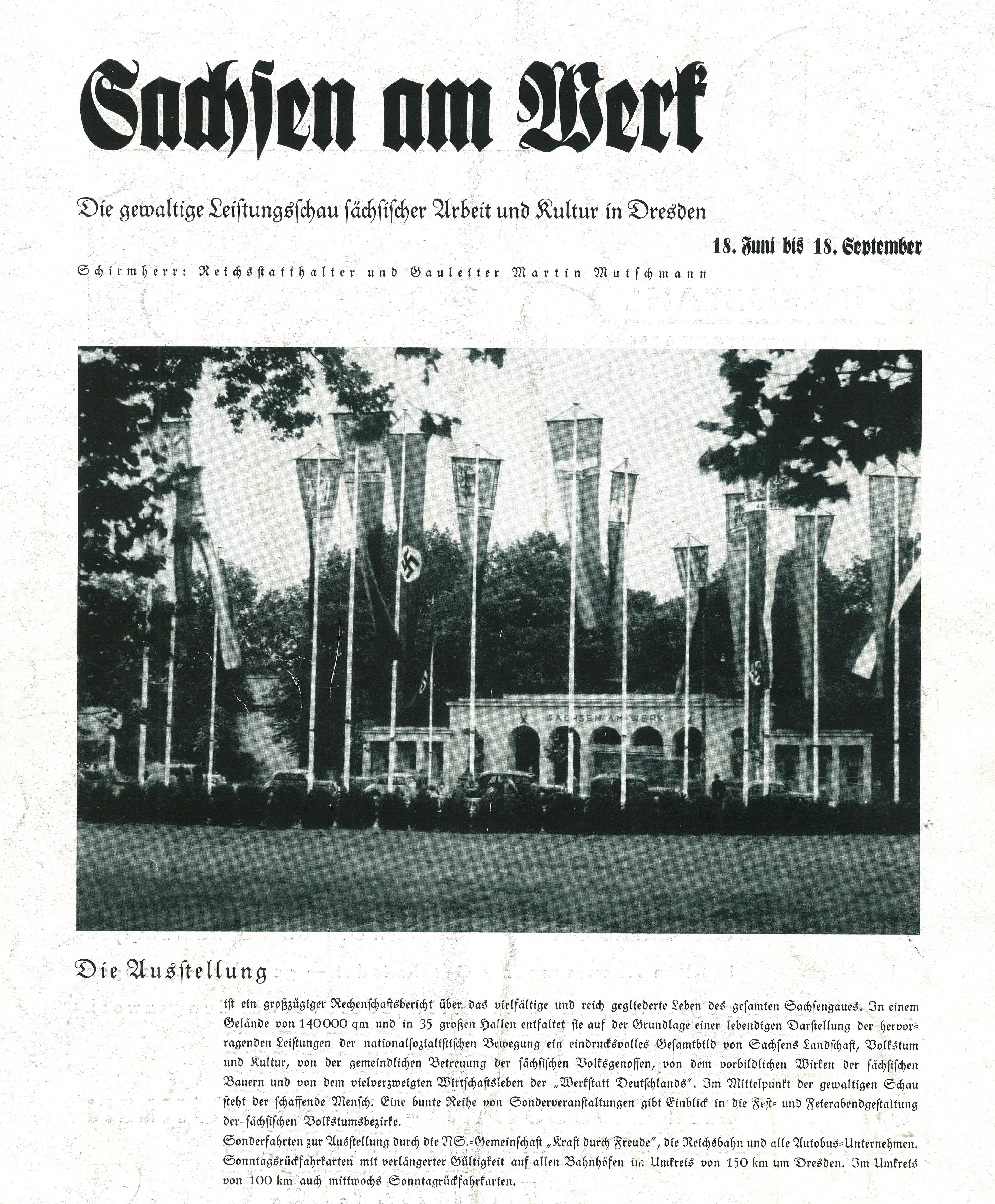 Auch die Ausstellung „Sachsen am Werk“, veranstaltet 1938 in Dresden, die unter anderem eine Darstellung von idealisierten Alltagswelten, so in Erzgebirgshäusern sowie durch volkskünstlerisches Handwerk, fokussierte, zählte zu jenen Strategien, die eine kulturelle und ethnisch sächsische Identität konstruierten, diese mit den weltanschaulichen Ideen des Nationalsozialismus verknüpften und dabei konsequent andere Kulturen und gesellschaftliche Gruppen ausschlossen.