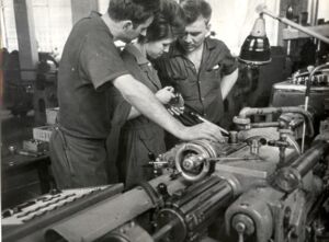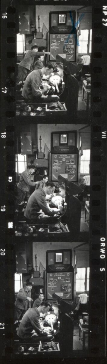 Hinter zwei Arbeitern, die einzelne Löffel abschleifen, ist hier ein Plakat zu sehen, das mit „Komplexbrigade Vorwärts“ überschrieben ist. Auf diesem sind wiederum die Schriftzüge „49 JAHRE SOWJETMACHT“ sowie „DER ERSTE ROTE MARSCHALL“ zu erkennen. Die darunter aufgeklebten Fotos sind auf den kleinen Abzügen kaum zu erkennen, sodass sich die Frage stellt: Welcher Person wurde hier gehuldigt?